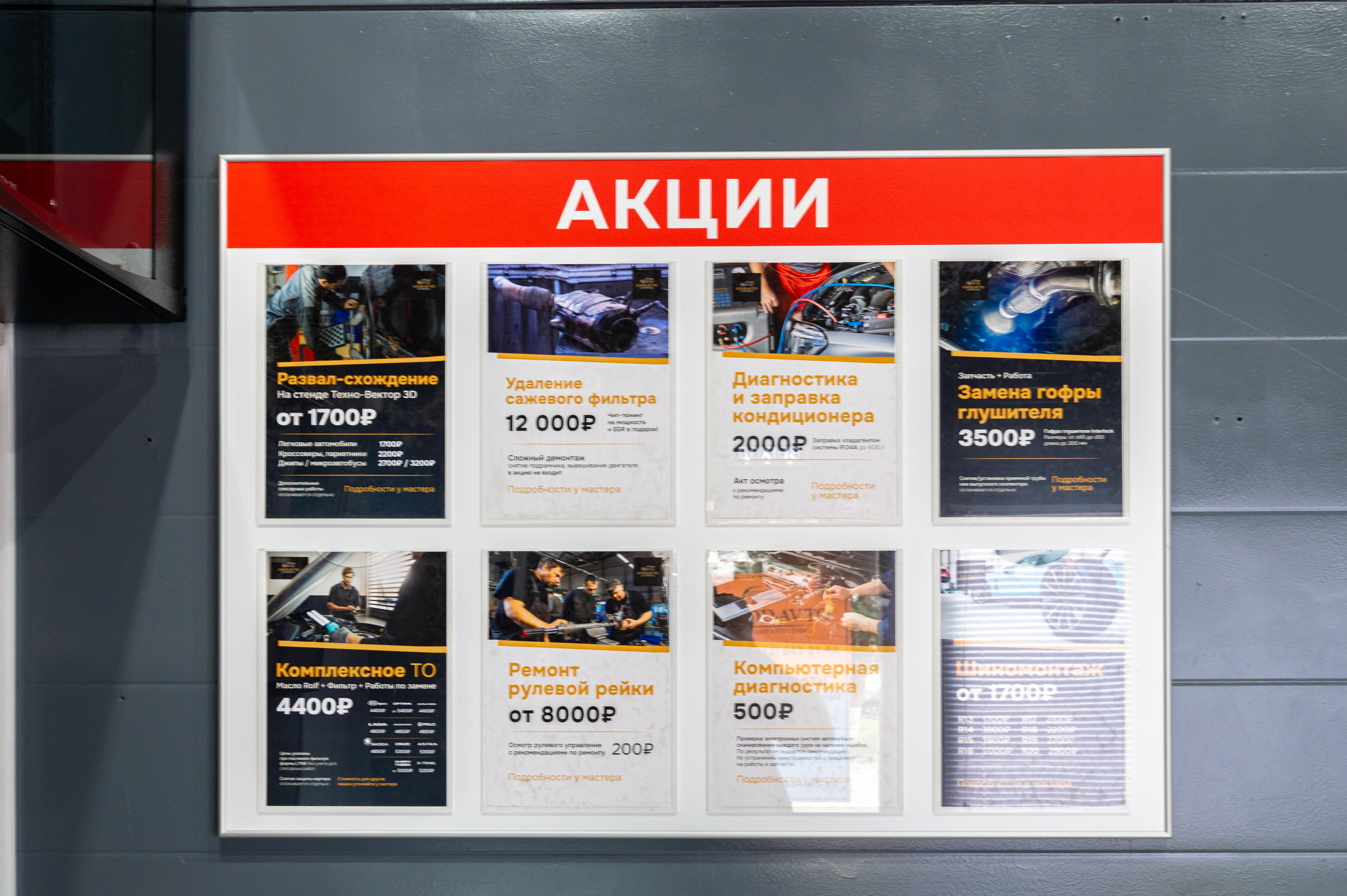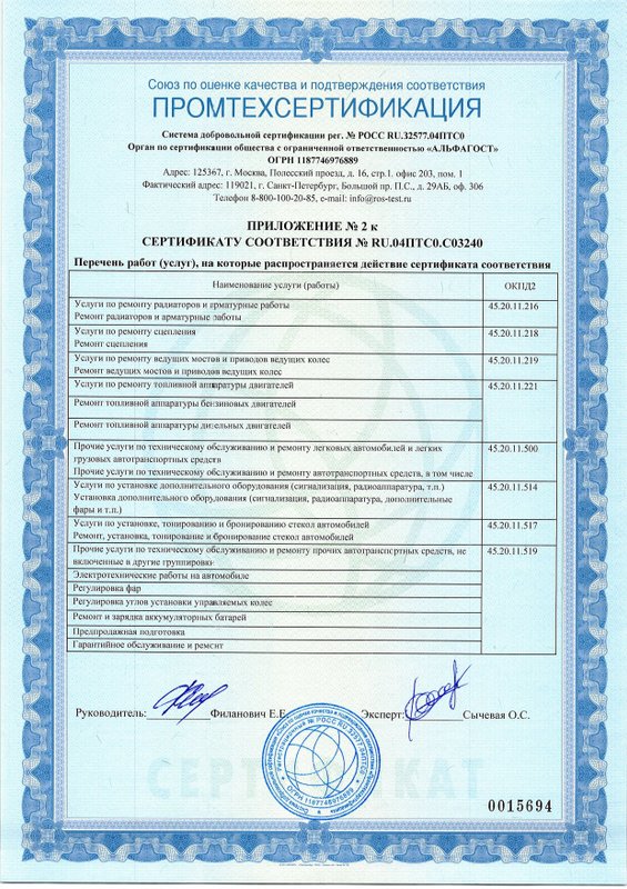 Компания располагает коллективом профессиональных автотехников: у нас выполняют замену масла, заправку и починку кондиционеров, ремонт АКПП, выхлопных систем, двигателей (в том числе дизельных), подвески и электронных систем управления автомобиля, сход-развал, шиномонтаж. На услуги мастерской предоставляется гарантия, срок которой зависит от вида работ и используемых материалов.